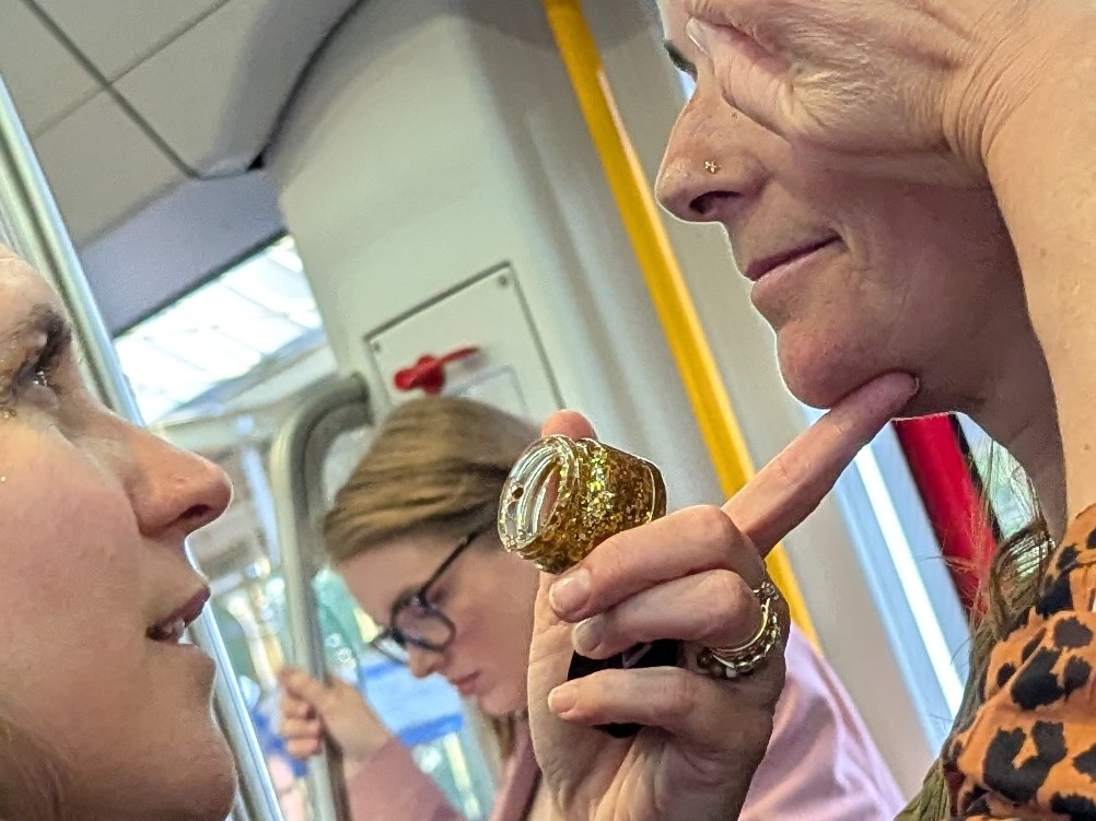 Already in the subway, we notice the crowd and the excitement. Next to us stands a woman with glitter around her eyes. My wife, who is also in a good mood, speaks to her. They immediately start a conversation. A little later, I see the woman pull out a glass jar filled with gold glitters. A few seconds later she started  decorating my wife with glitters. First next to her eyes and on her forehead, then on her eyelids. It is a nice little job. They are so focused that they are not distracted by the drastic acceleration and braking of the subway.​
