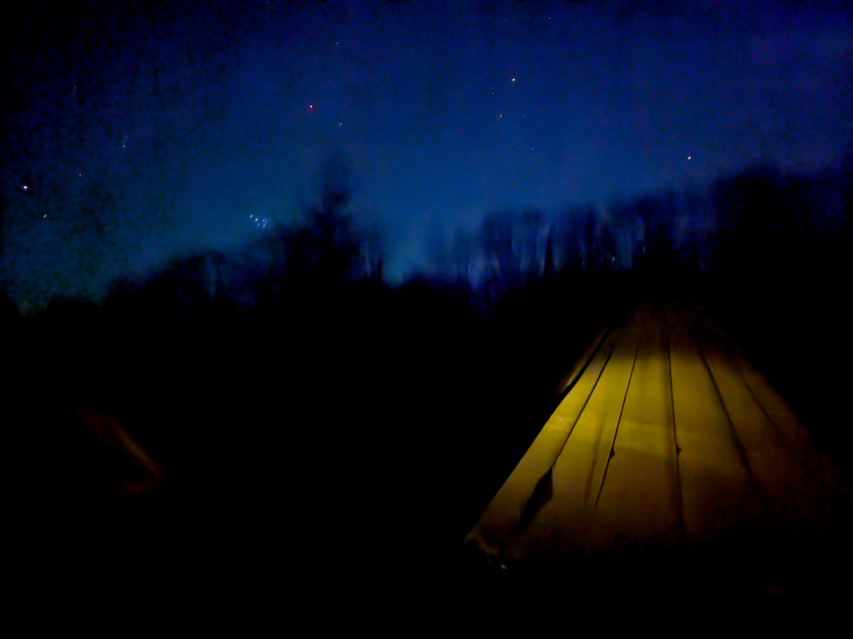 I am being kidnapped. I am not allowed to know where we are going, but I do have a suspicion. The route heads towards Drenthe. We drive past fields and farms and, after two hours of driving, slip onto a bumpy forest road. We open a roadblock consisting of a thick, rotating wooden beam, park the car, and continue on foot. Then the terrain opens up, and on a spacious meadow stand 4 tipis with their wide brown dresses elegantly draped over the earth.