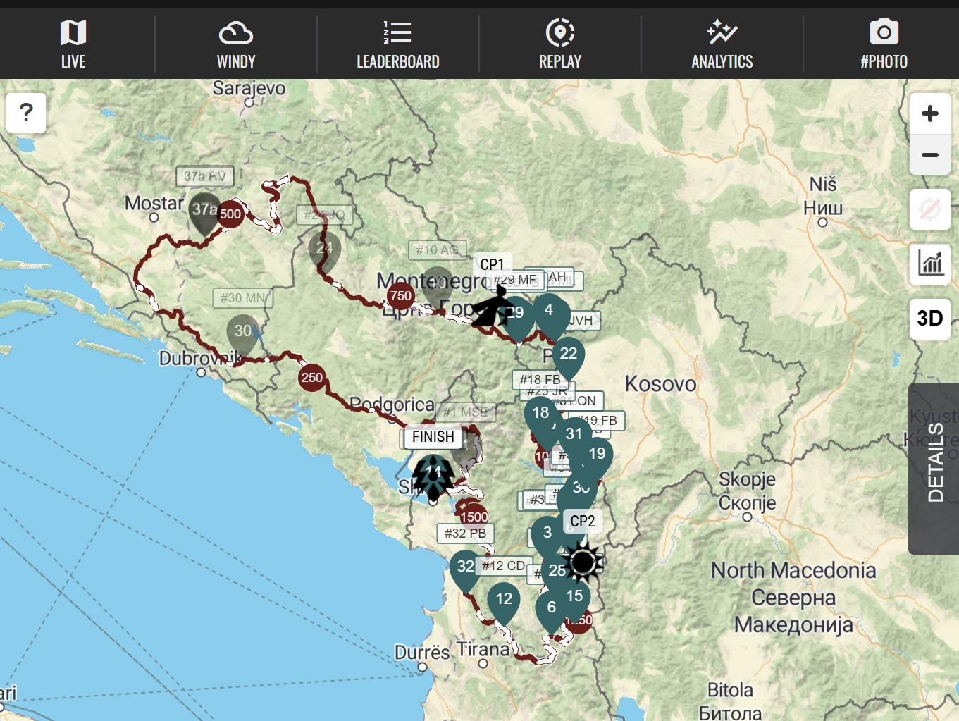 We follow Urs with a DotWatcher, a website where the runners are reduced to an inverted green droplet on the map containing a number. The screen refreshes every minute, allowing you to precisely track where the runners are, their speed, and how much battery their tracker has left. For some, the droplet has turned pale green. They are sleeping. For others, the droplet is gray. They have given up.